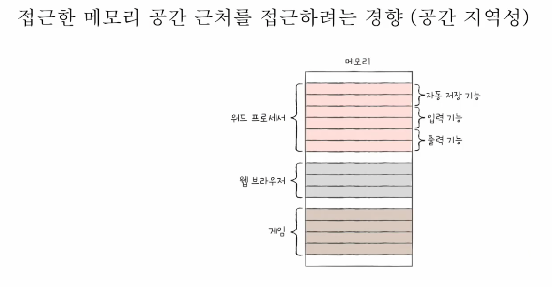 - 경향 2: CPU는 접근한 메모리 공간 근처를 접근하는 경향이 있다. (공간 지역성)