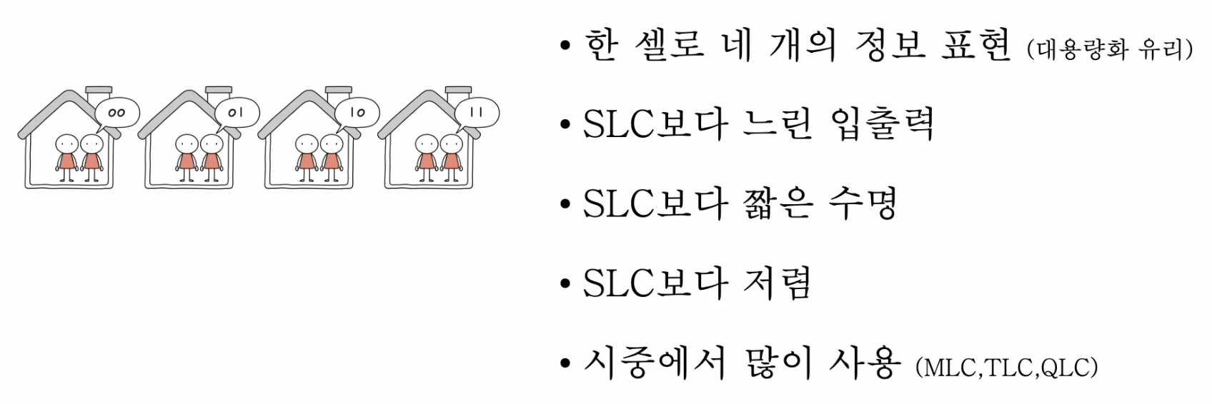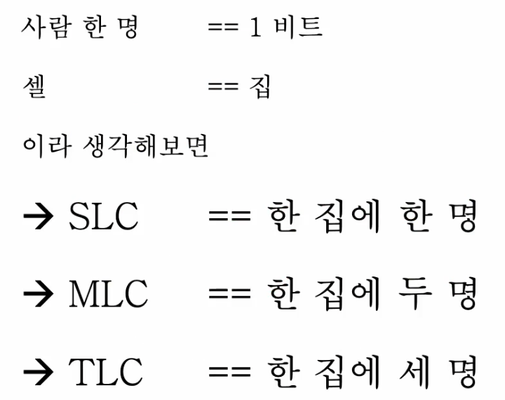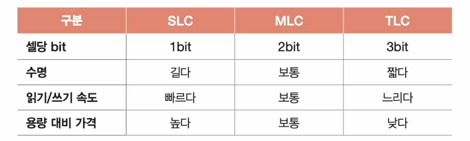 - SLC(single level cell): 한 셀에 1비트를 저장할 수 있는 플래시 메모리