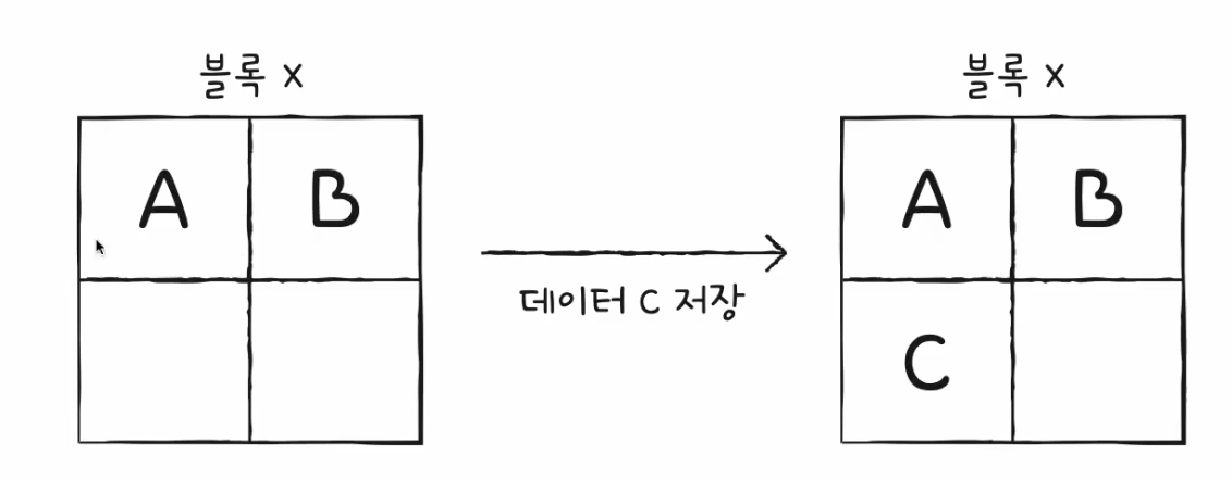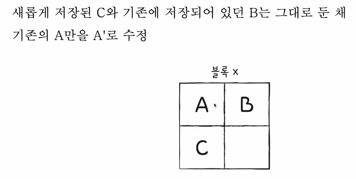 - 삭제는 블록(block)단위로 이루어지기 때문에 A만 삭제하는 것은 불가