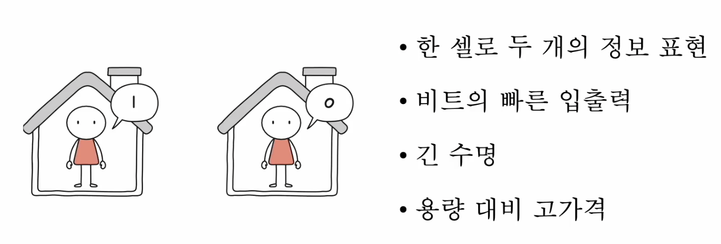 - 한 셀에 한 비트가 저장되어 있기 때문에 한 셀로 두 개의 정보가 표현할 수 있다.