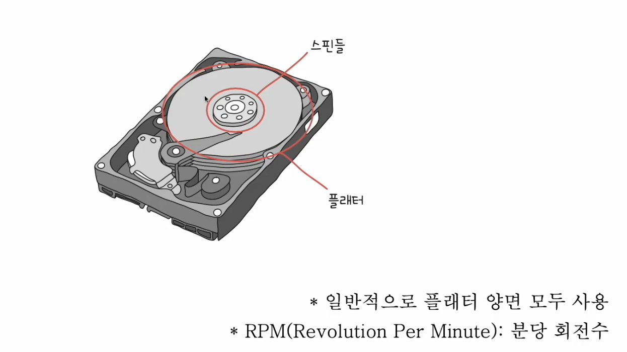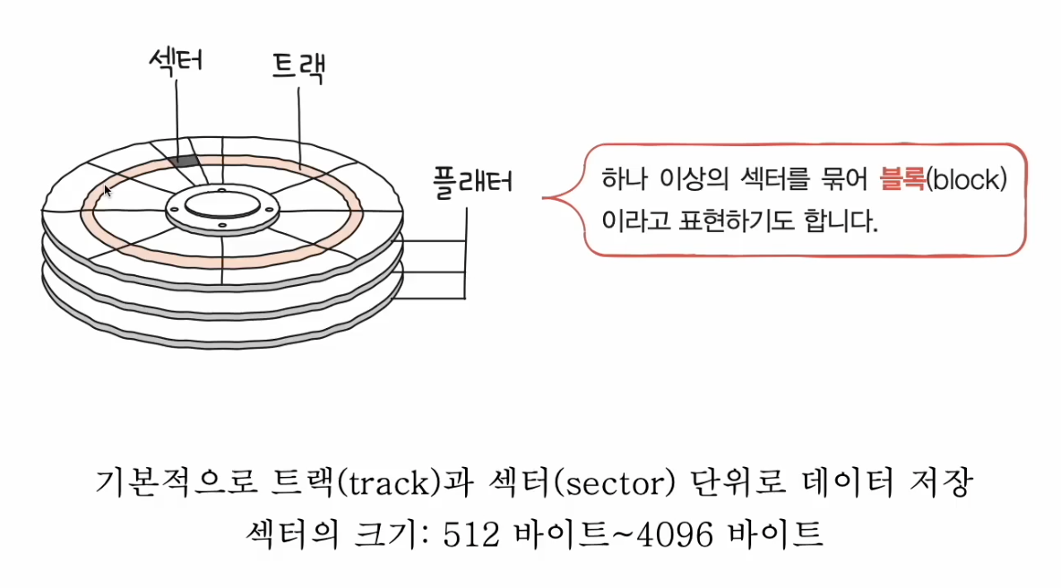 플래터에 저장이 되며 섹터와 트랙 단위로 데이터가 저장된다.