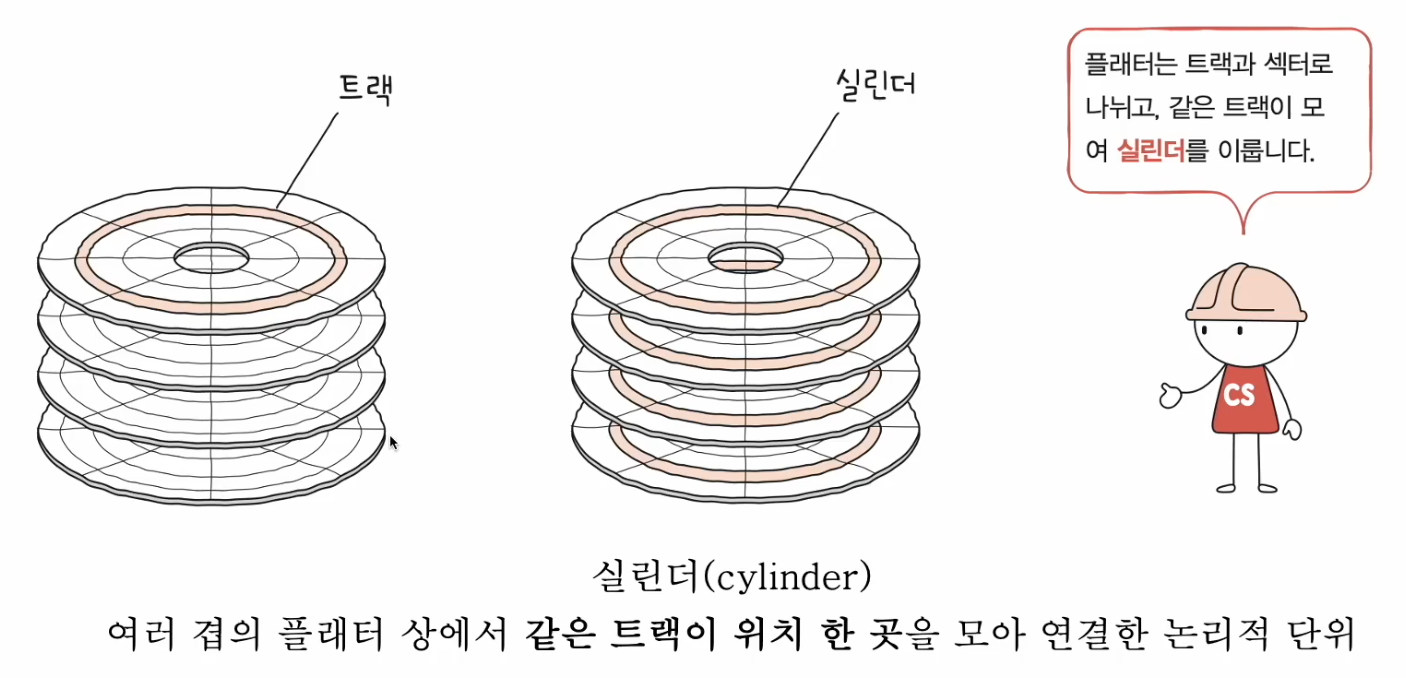 기본적으로 플래터는 양면이 모두 사용될 수 있는데 같은 트랙이 위치한 곳을 모아 연결한 곳을 실린더라고 함.