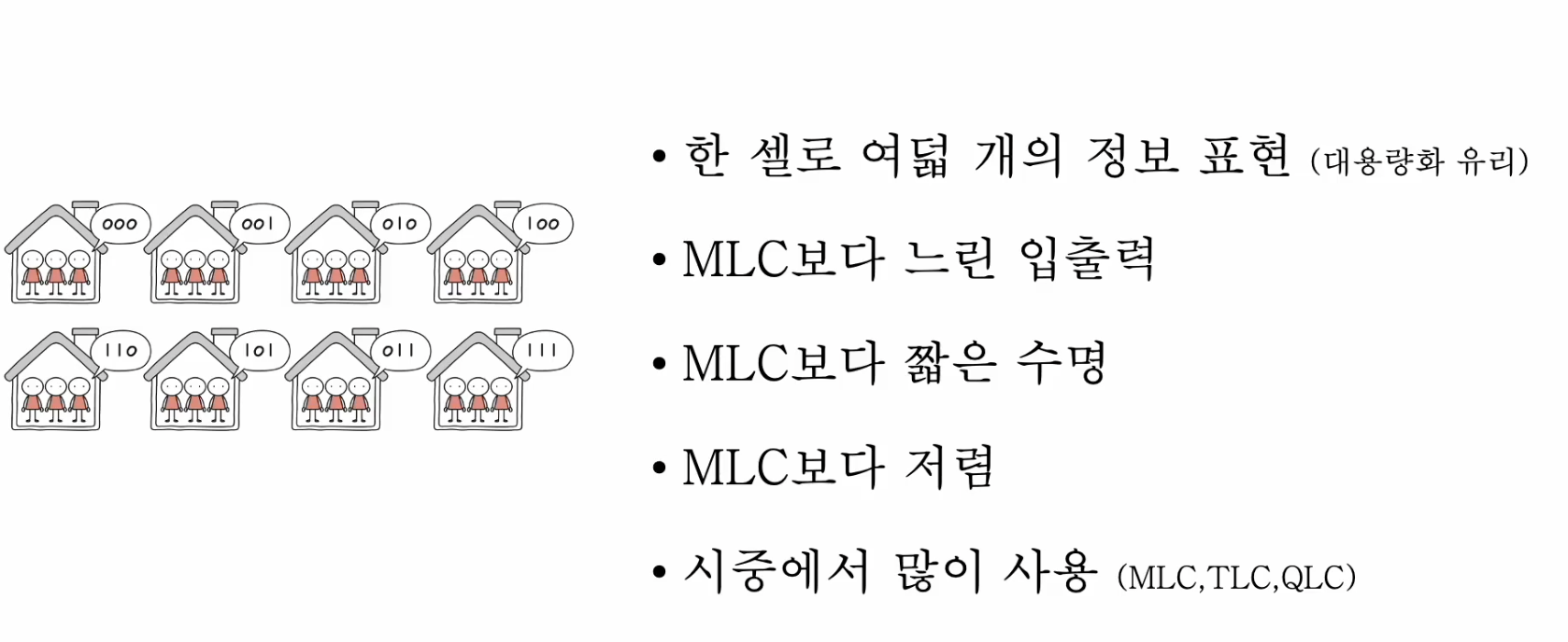 - TLC: 한 셀에 3비트를 저장할 수 있는 플래시 메모리