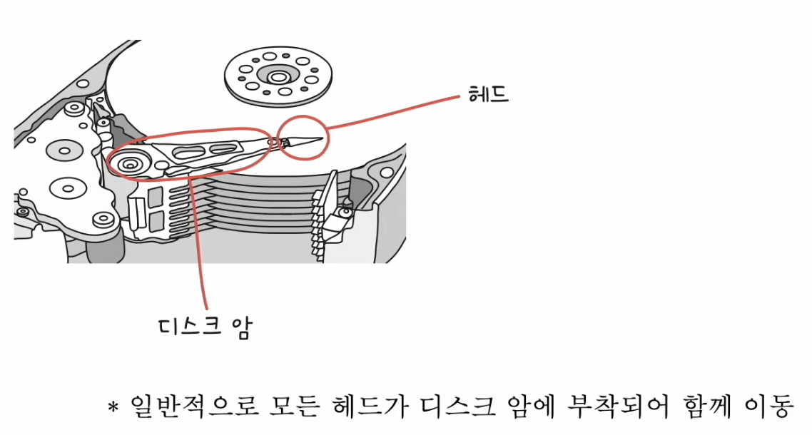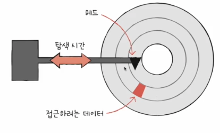 - 탐색 시간 (seek time) : 접근하려는 데이터가 저장된 트랙까지 헤드를 이동시키는 시간