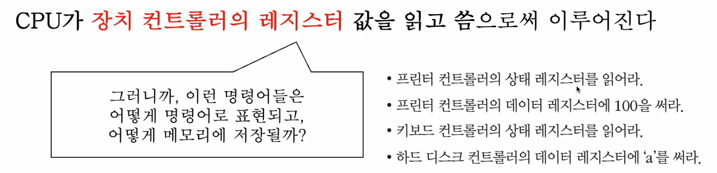 CPU가 장치컨트롤러의 레지스터 값을 읽고 씀으로써 이루어진다.