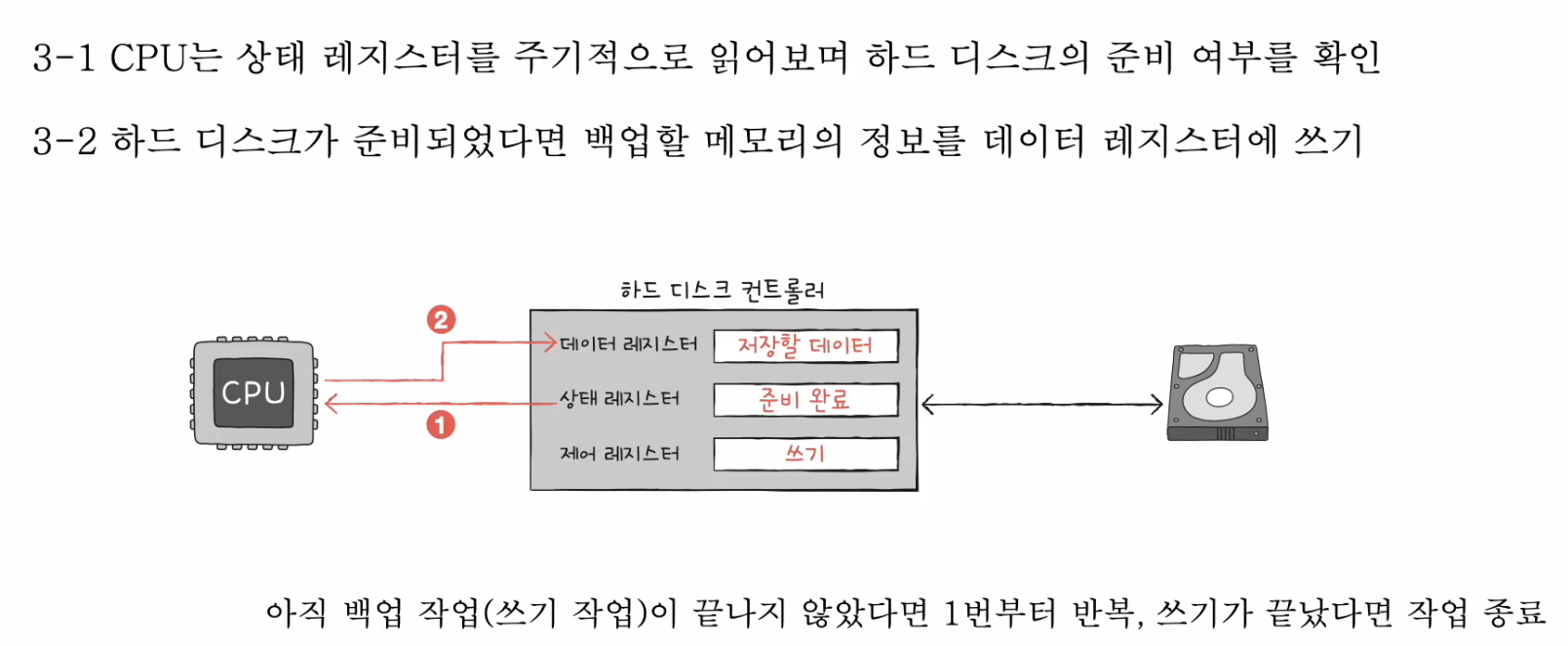 - 입출력장치와 메모리 간의 데이터 이동은 CPU가 주도하고