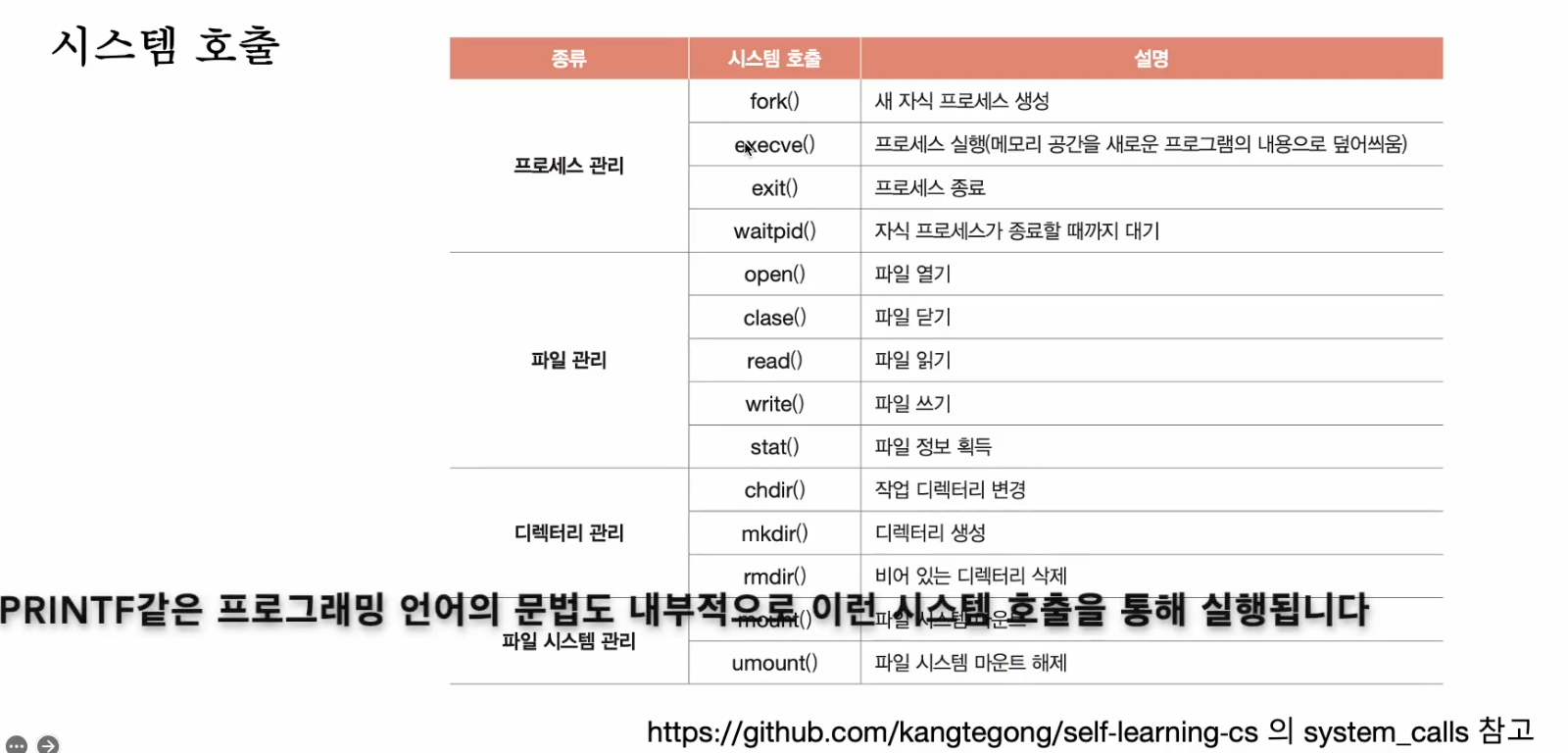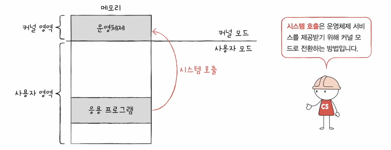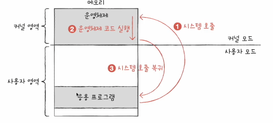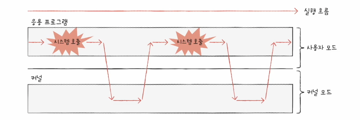 * 시스템 호출 : 커널모드로 전환하여 실행하기 위해 호출, 일종의 소프트웨어 인터럽트