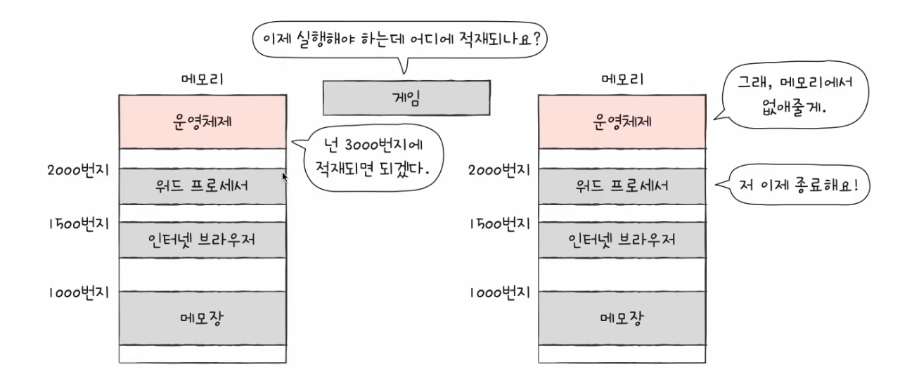 - 메모리에 접근하여 할당 : 메모리의 비어있는 공간에 새로운 실행 프로그램을 적재하거나, 적재할 프로세스가 메모리크기에 비해 훨씬 클때 등 쓰는 기법