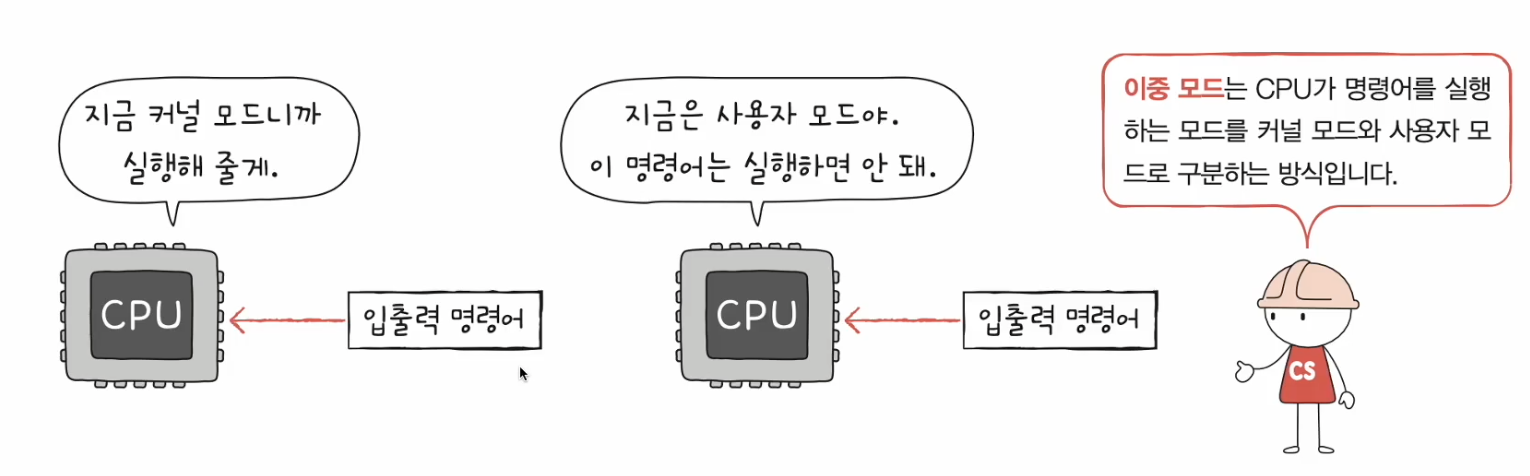 * 이중모드 : CPU가 명령어를 실행하는 모드를 사용자 모드와 커널 모드로 구분하는 방식