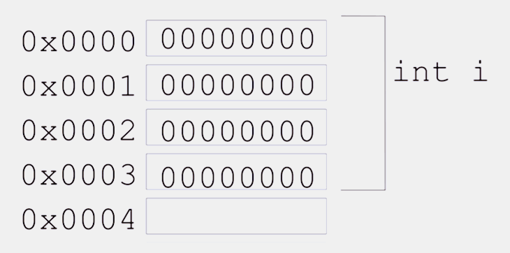 | 2 | int i = 0; | 예약한 메모리 영역 ( 0X0000 ~ 0X0003)에 int i의 값(0)이 저장된다. |