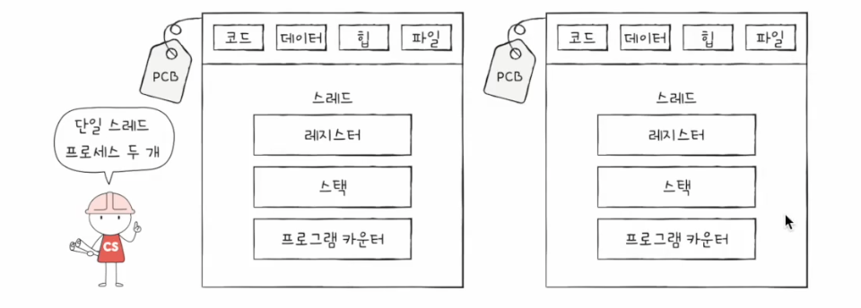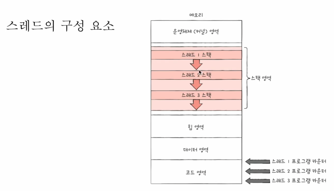 - 각기 다른 스레드 ID(별도의 실행을 위해 꼭 필요한), 프로그램 카운터 값을 포함한 레지스터 값, 스택을 가질 뿐