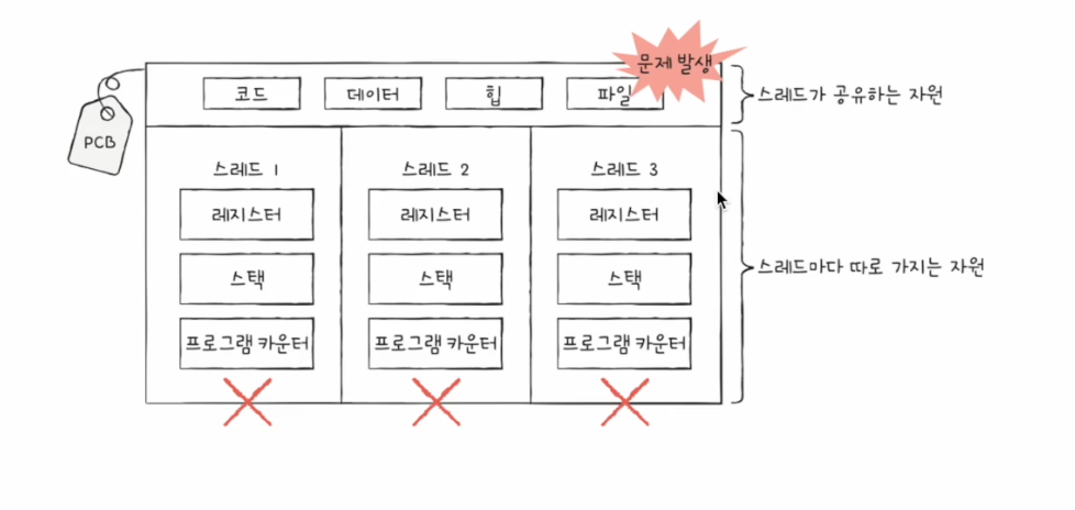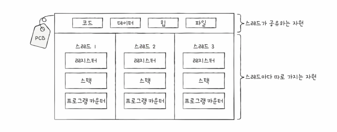 - 하지만 스레드들은 프로세스가 가지는 자원을 공유한다.