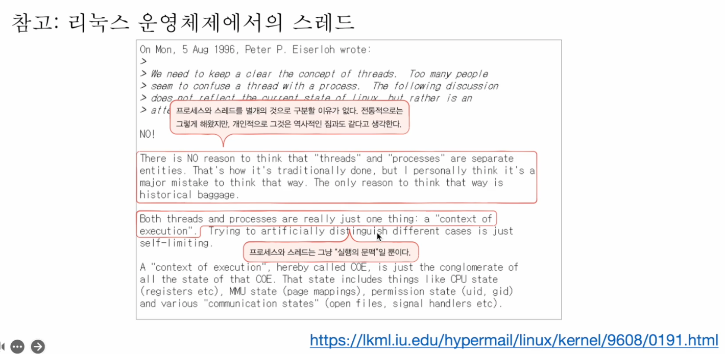 실제로 요즘, 처리해야할 작업을 CPU에게 전달할 때 통째로 process단위가 아닌 thread 단위로 전달하는 추세