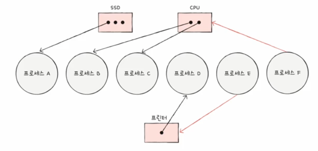 - 4.프로세스가 어떤 자원을 기다리고 있다면 프로세스에서 자원으로 화살표를 표시