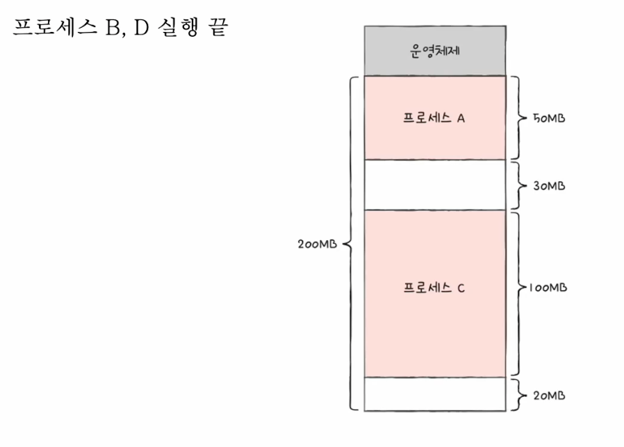- 프로세스들이 실행되고 종료되길 반복하며 메모리 사이 사이에 빈 공간이 발생한다.