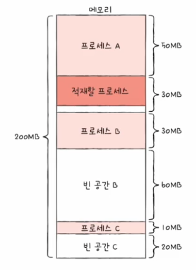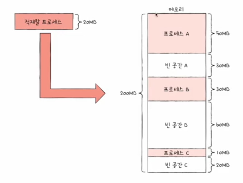프로세스는 메모리의 빈 공간에 할당되어야 한다. 빈 공간이 여러 개 있다면?
