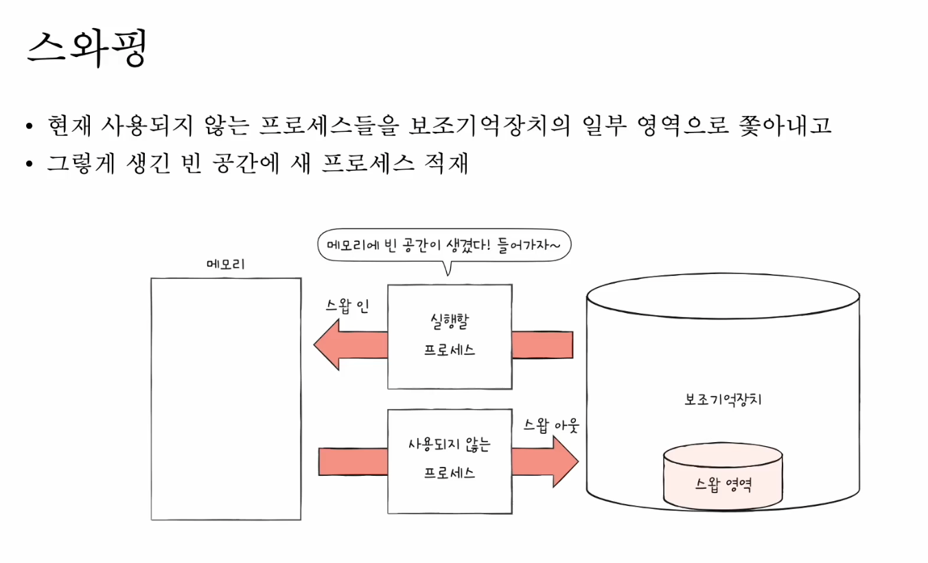 - swap in: 스왑 영역에서 메모리로 다시 적재