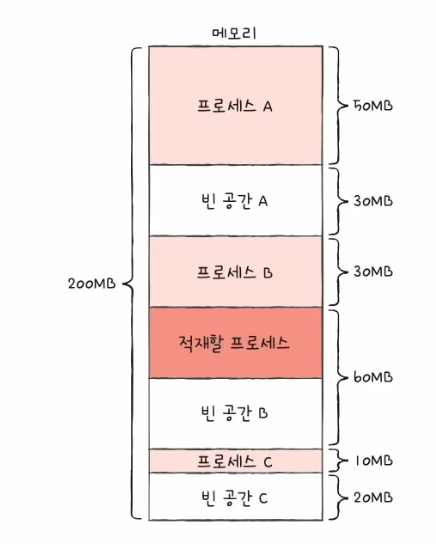 - 연속 메모리 할당의 방법: 어떤 빈 공간에 어떻게 할당할지