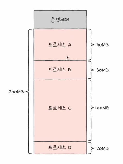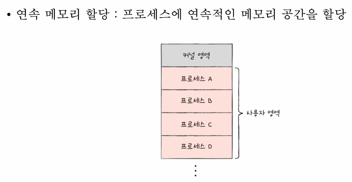 사실 프로세스를 연속적으로 메모리에 할당하는 방식은 메모리를 효율적으로 사용하는 방법이 아니다.