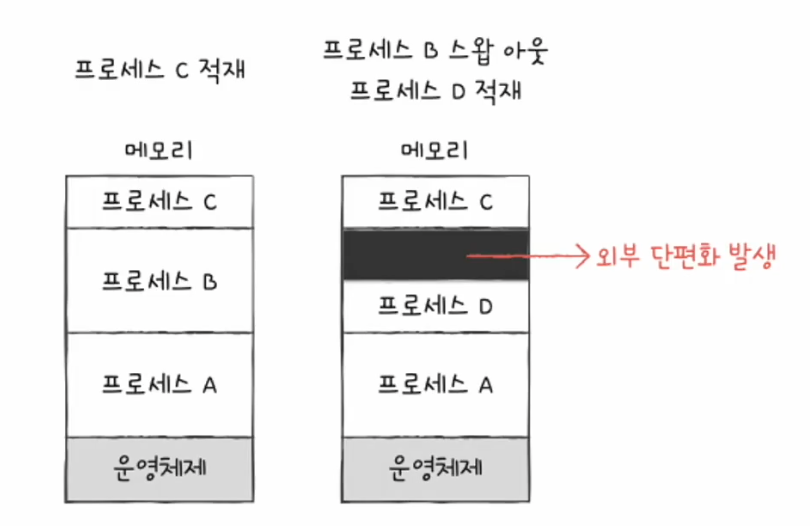 즉 연속된 메모리 공간 할당은 외부 단편화라른 부작용을 초래한다.