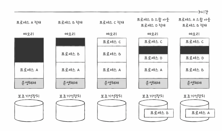 - 현재 사용되지 않는 프로세스들을 보조기억장치의 일부 영역(swap 영역)으로 쫓아내고 그렇게 생긴 빈 공간에 새 프로세스를 적재