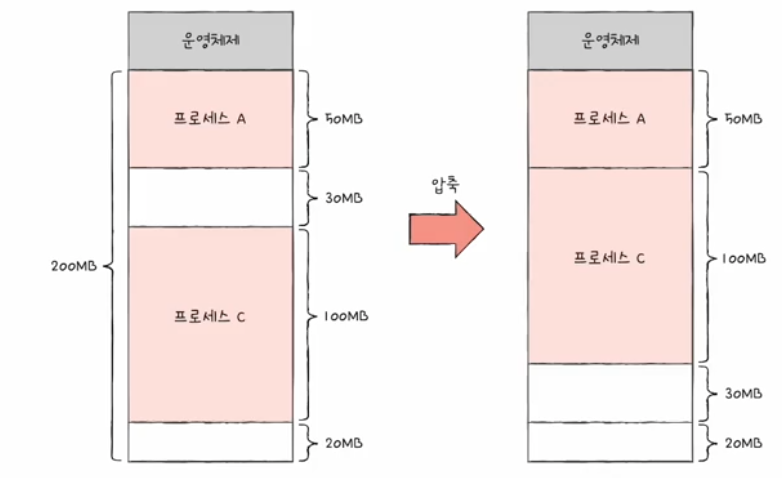 - 프로세스를 적당히 재배치시켜 흩어져 있는 작은 빈 공간들을 하나의 큰 빈 공간으로 만드는 방법
