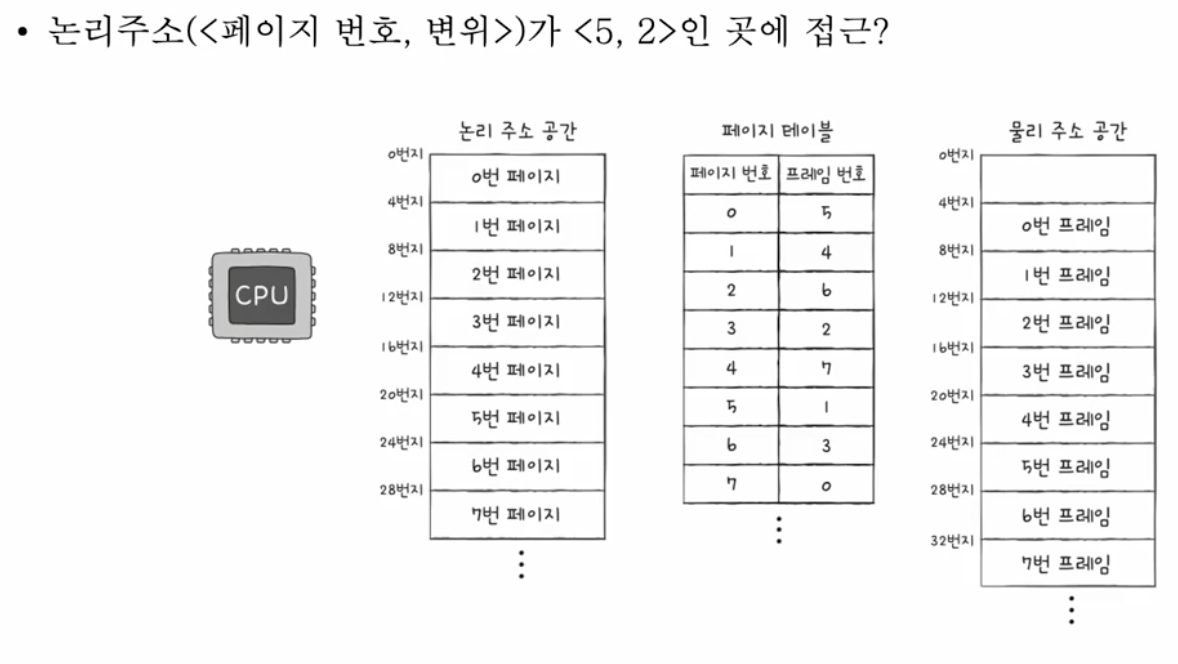 - <페이지 번호, 변위>로 이루어진 논리 주소는 페이지 테이블을 통해 <프레임 번호, 변위>로 변환된다.