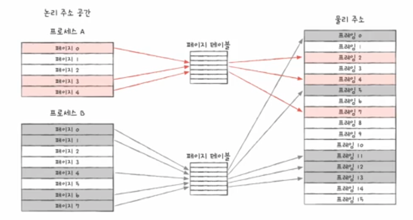물리적으로 분산되어 저장되더라도 CPU입장에서 바라본 논리 주소는 연속적으로 보인다.