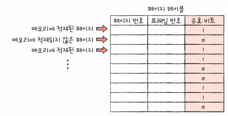 - 유효 비트가 0인 페이지에 접근하려고 하면? : 페이지 폴트(page fault)라는 인터럽트가 발생