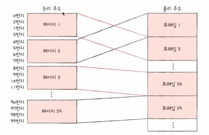 - 메모리의 물리 주소 공간을 프레임(frame)이라는 페이지와 동일한 일정 단위로 자른 뒤