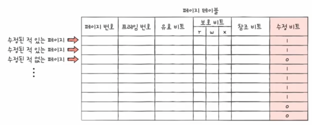 - 이 페이지가 메모리에서 사라질 때 보조기억장치에 쓰기 작업을 해야하는지, 할 필요 없는지 체크