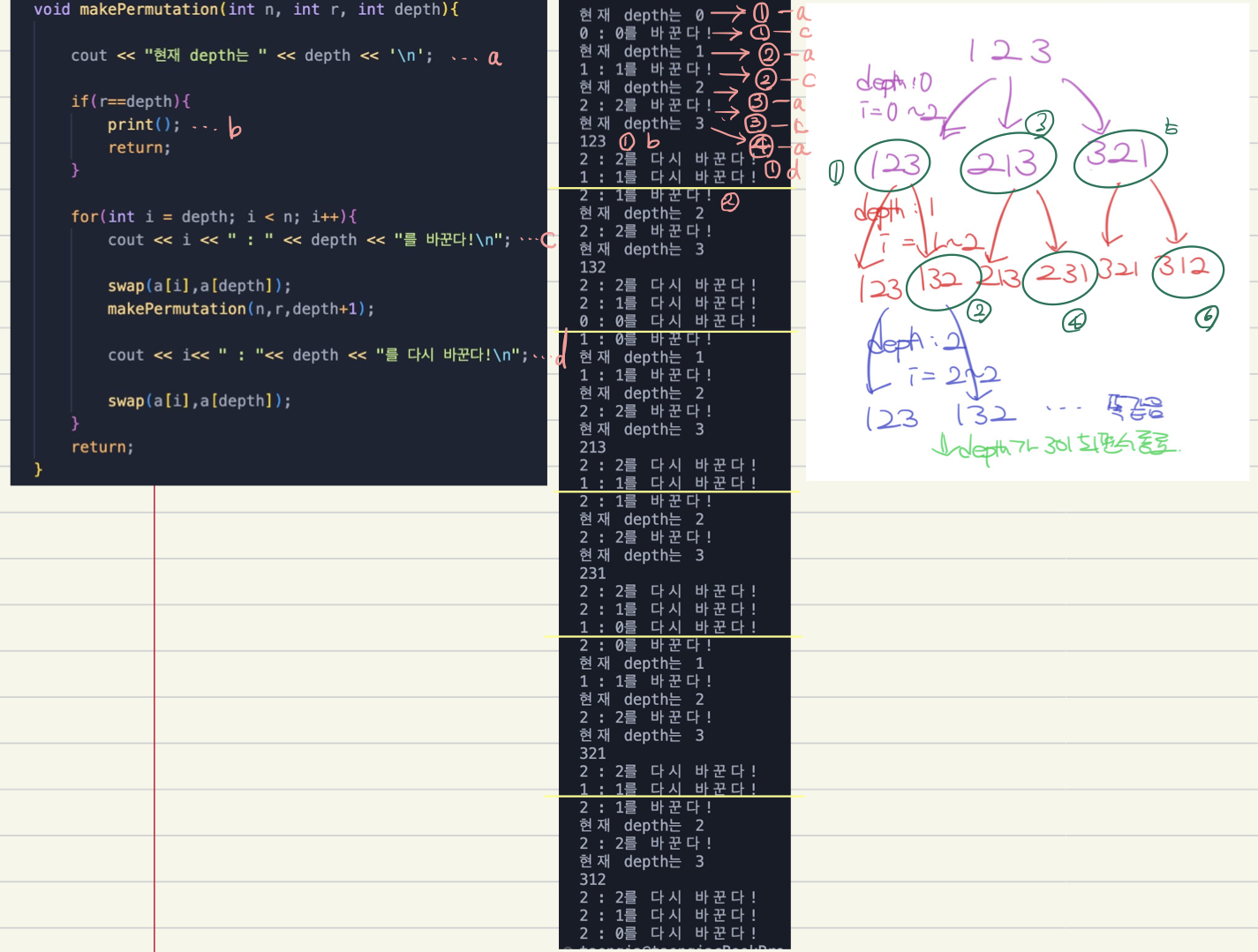 정확히 로직의 순서를 다 따라가진 못했지만, 대충 몇 depth의 재귀에서 swap이 일어나고 또 반복되는 것인지 감은 온 것같다.
