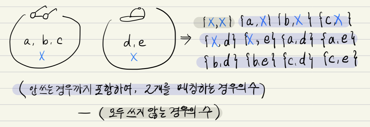 첫 번째 테스트 케이스는 headgear에 해당하는 의상이 hat, turban이며 eyewear에 해당하는 의상이 sunglasses이므로 (hat), (turban), (sunglasses), (hat,sunglasses), (turban,sunglasses)로 총 5가지 이다.