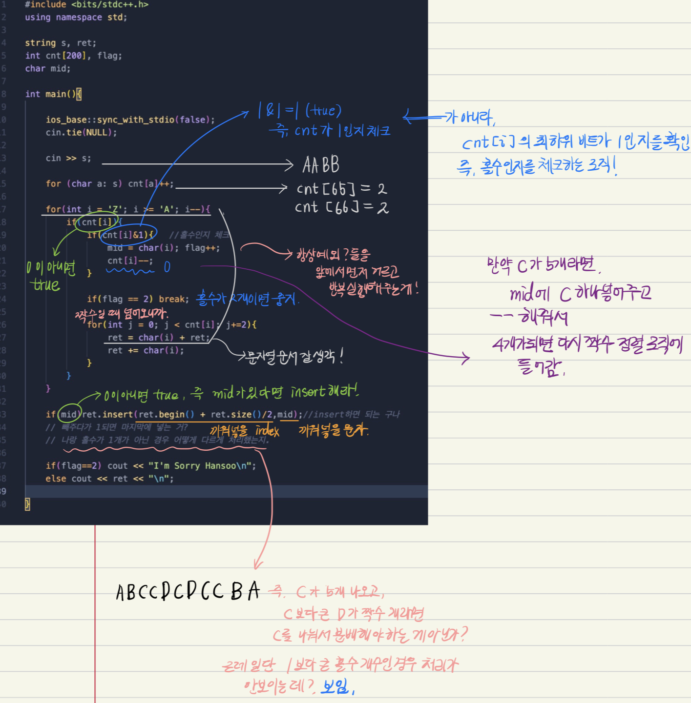 - 짝수 여러개 + 홀수 하나 : 팰린드롬 가능