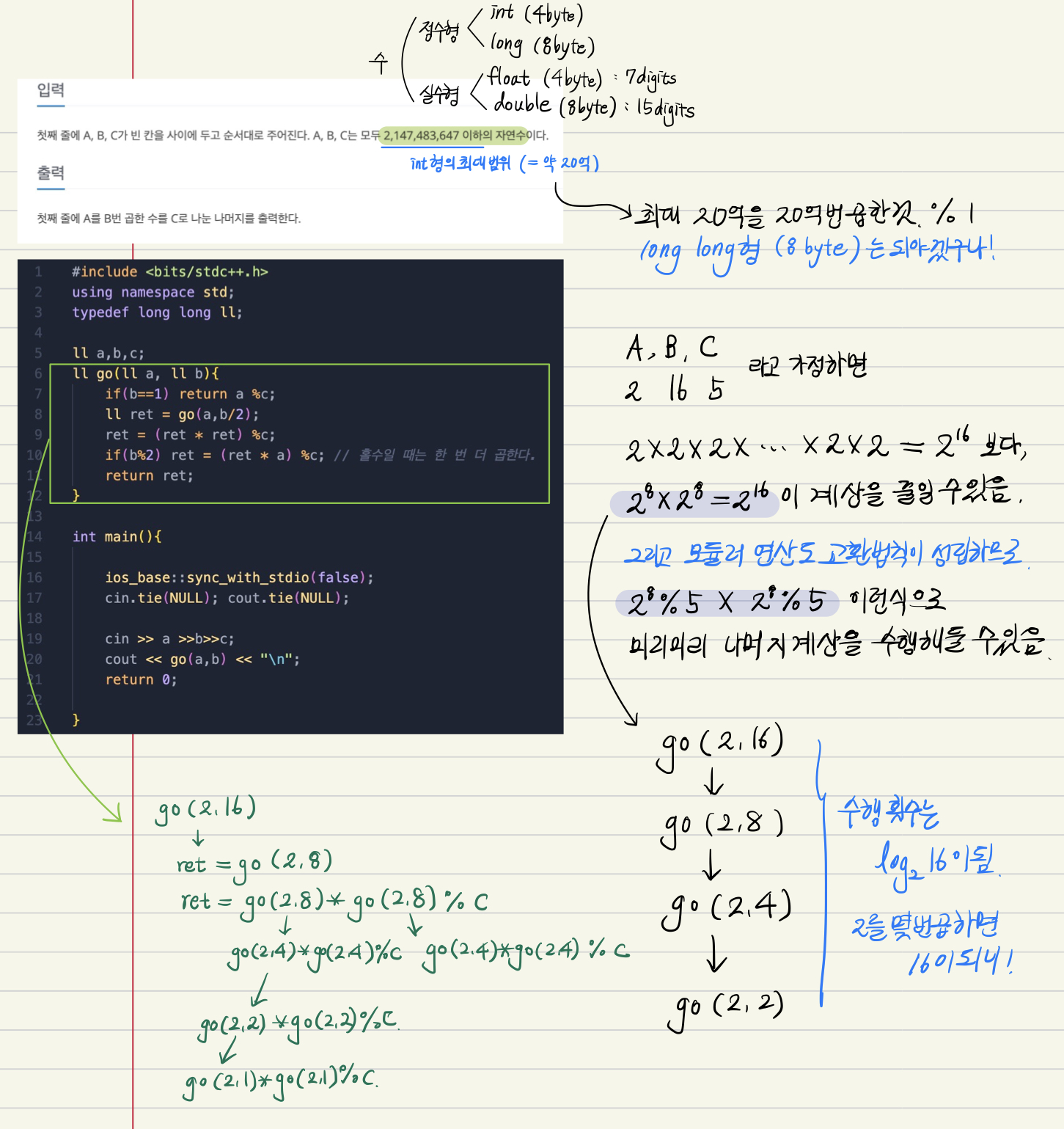 ② 모듈러 연산에서 교환법칙이 성립한다는 것을 이용해 중간중간 나머지 연산을 해주어야 한다는 것이 포인트