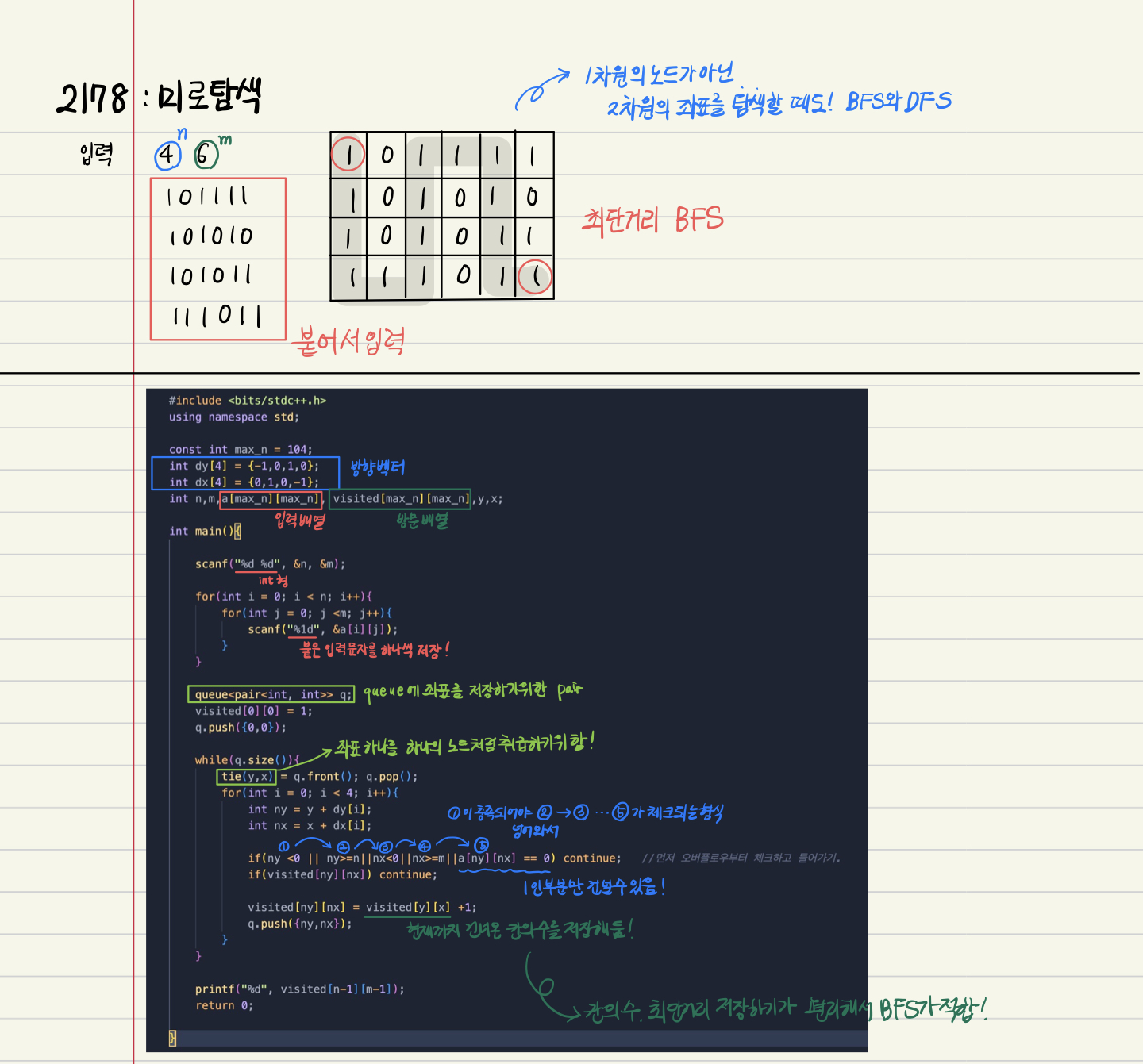 2178 : 미로 탐색 - 붙어서 입력(scanf("%1d")), 2차원 배열, 방문배열, BFS, 방향벡터, pair,tie 본문