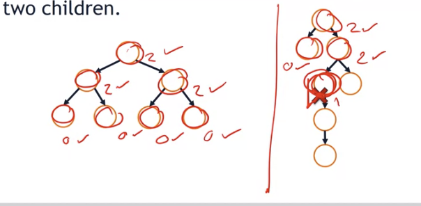 A binary tree is full if and only if every node has either zero children or two children.