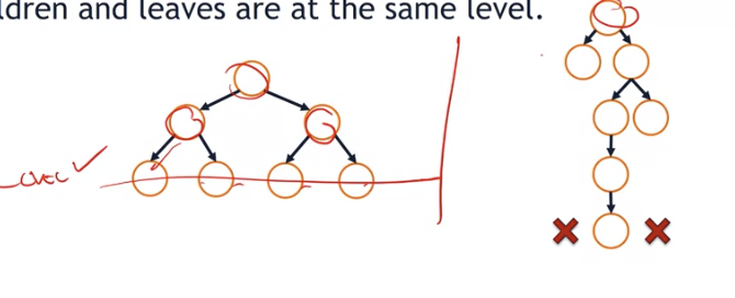 A binary tree is perfect if and only if all interior nodes have two children and leaves are at the same level.