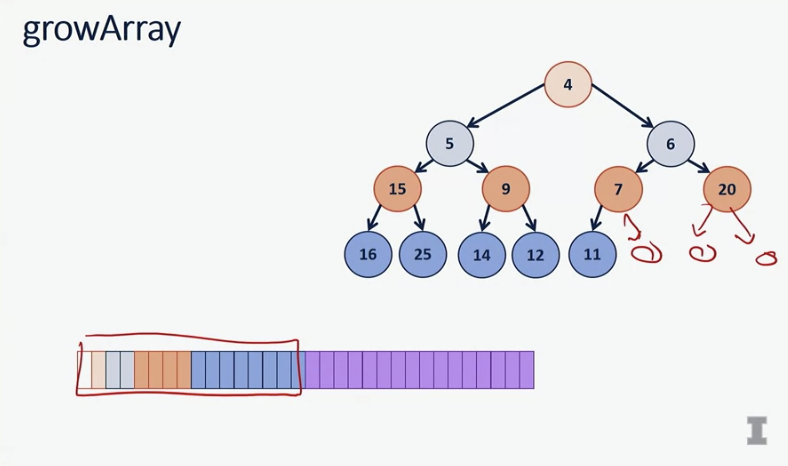 When we double the array, notice that our old array is going the contain all of the elments in the blue and orange layer. here when I fill up this last blue layre, I need to expand the array to add an entire new layer of the tree. This is equivalent to doubling the size of the array, by making a left and right child at every single node.