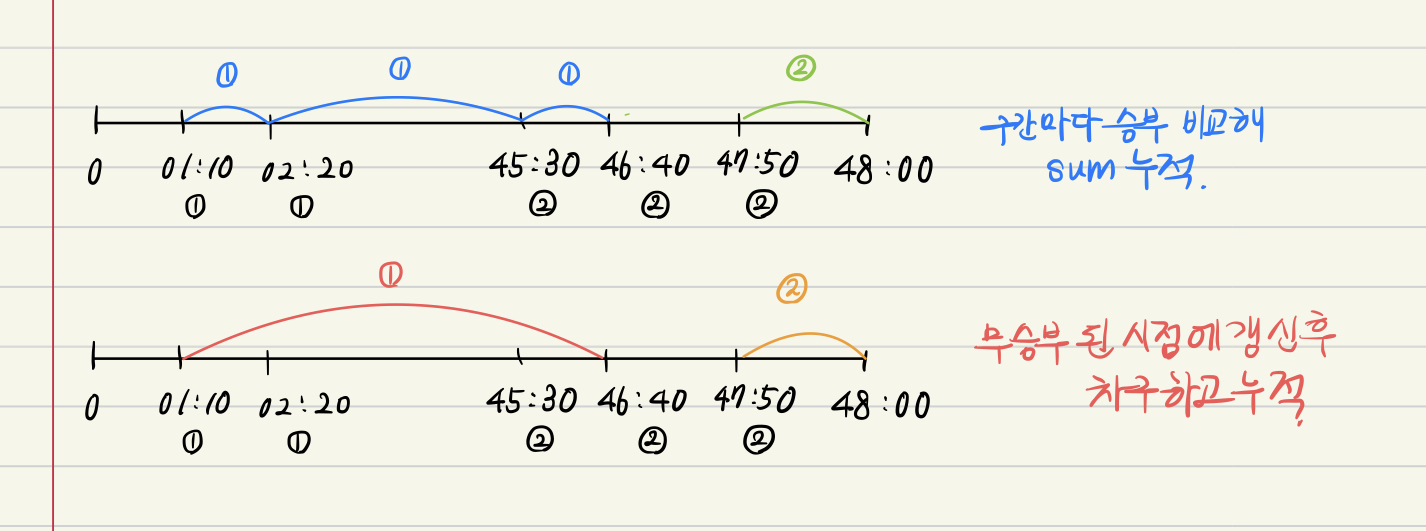 - 골이 들어간 시점 모든 구간 마다, 이긴 사람에게 그 구간을 더해주는 sum의 형식으로 구현했다.