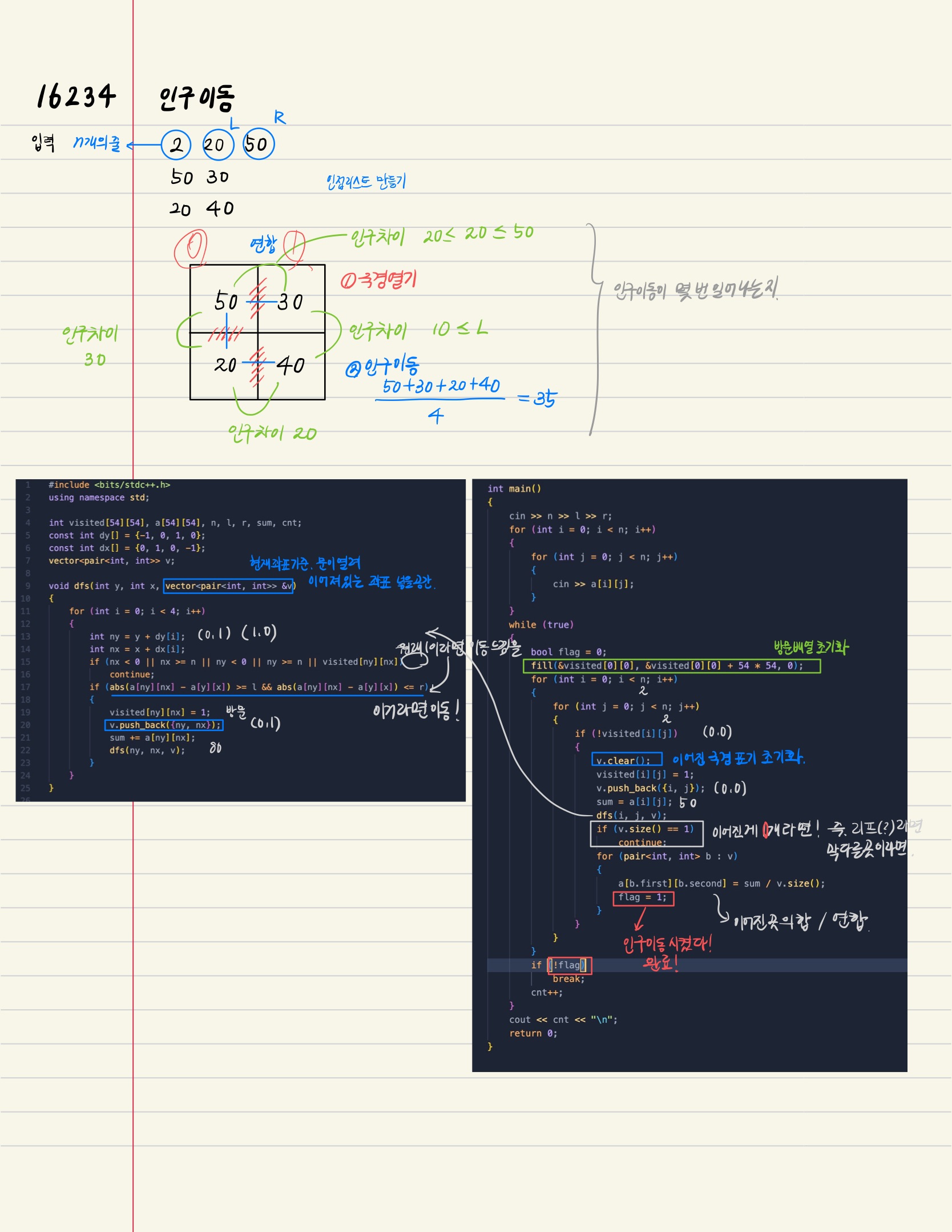 문제의 조건에 따라 차가 l이상 r이하라면 ( abs(a[ny][nx] - a[y][x]) >=l && abs(a[ny][nx] - a[y][x]))때 이동하면 된다.
