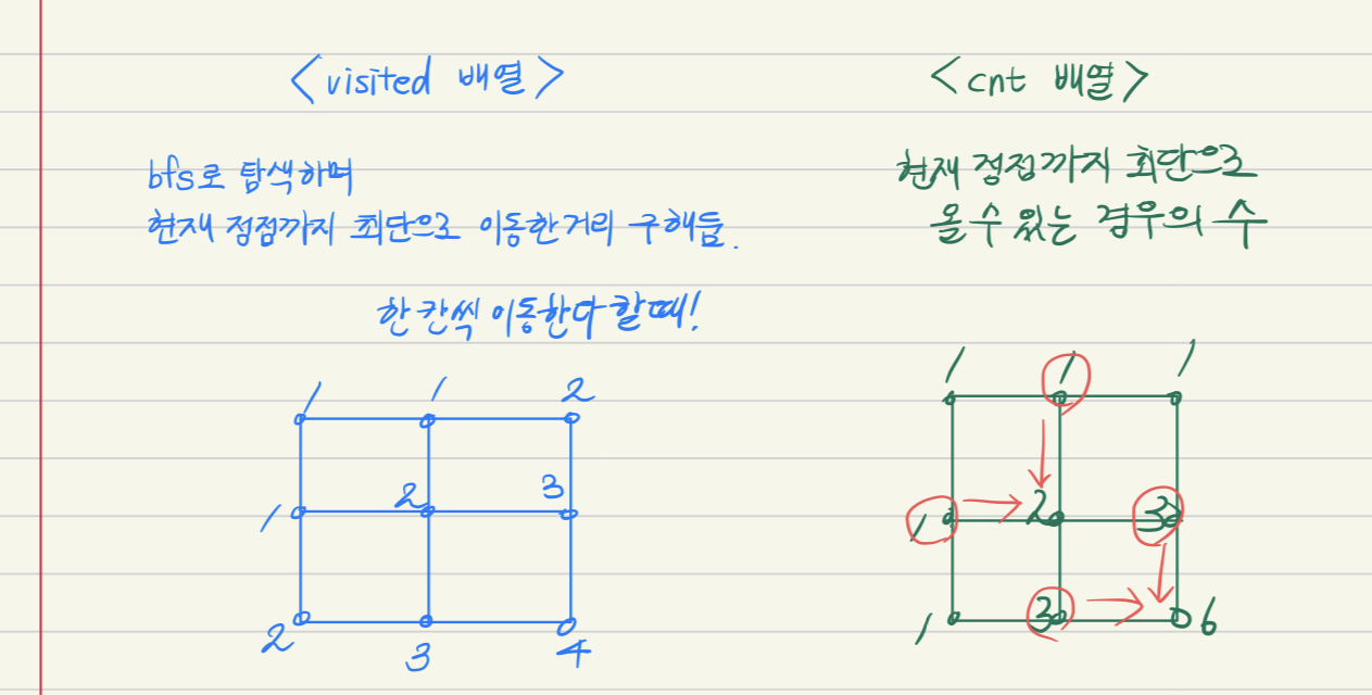 bfs로 최단 거리로만 탐색해 가며 경로의 경우의 수를 누적하고 도착지에 누적되어 있는 경우의 수를 이용하는 방식.