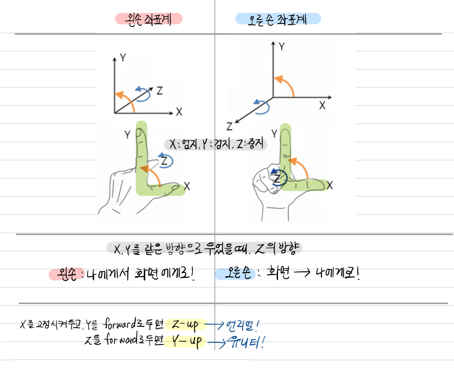 - 유니티: 왼손 좌표계 Y-up