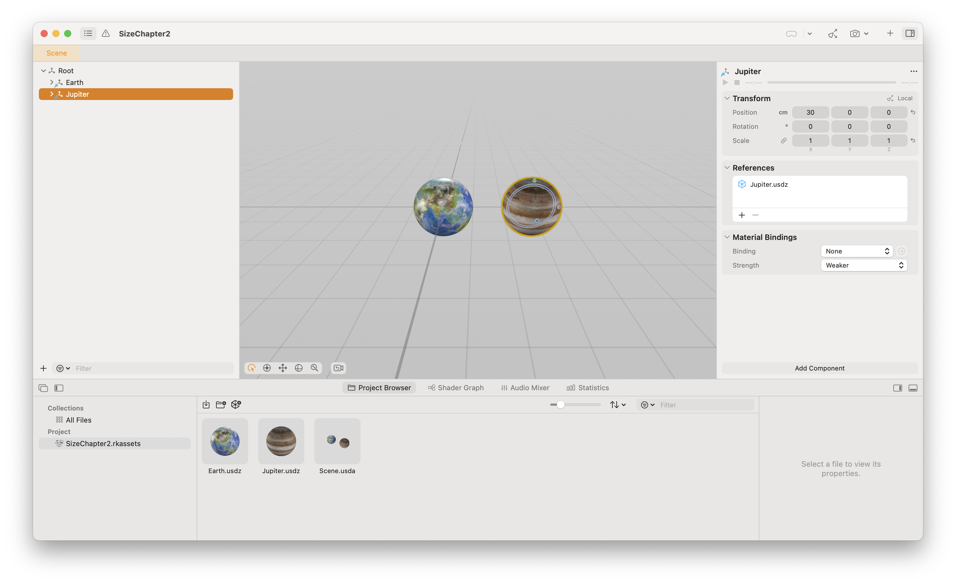 RealityKitContent라는 것을 import하면 real Composer Pro의 Scene에 있는 각 모델들(Earth, Jupiter)에 개별 접근하고,