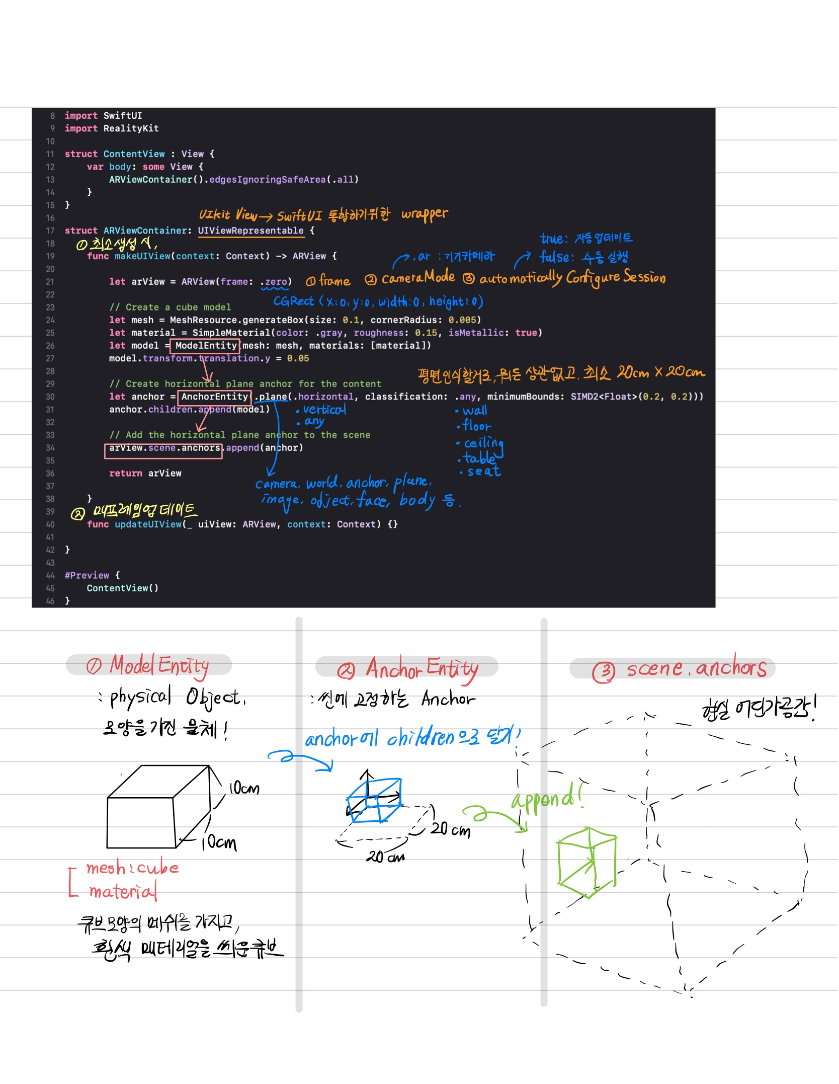 - RealityKit: material을 씌운 modelEntity를 AnchorEntity에 달아 scene.anchor에 추가