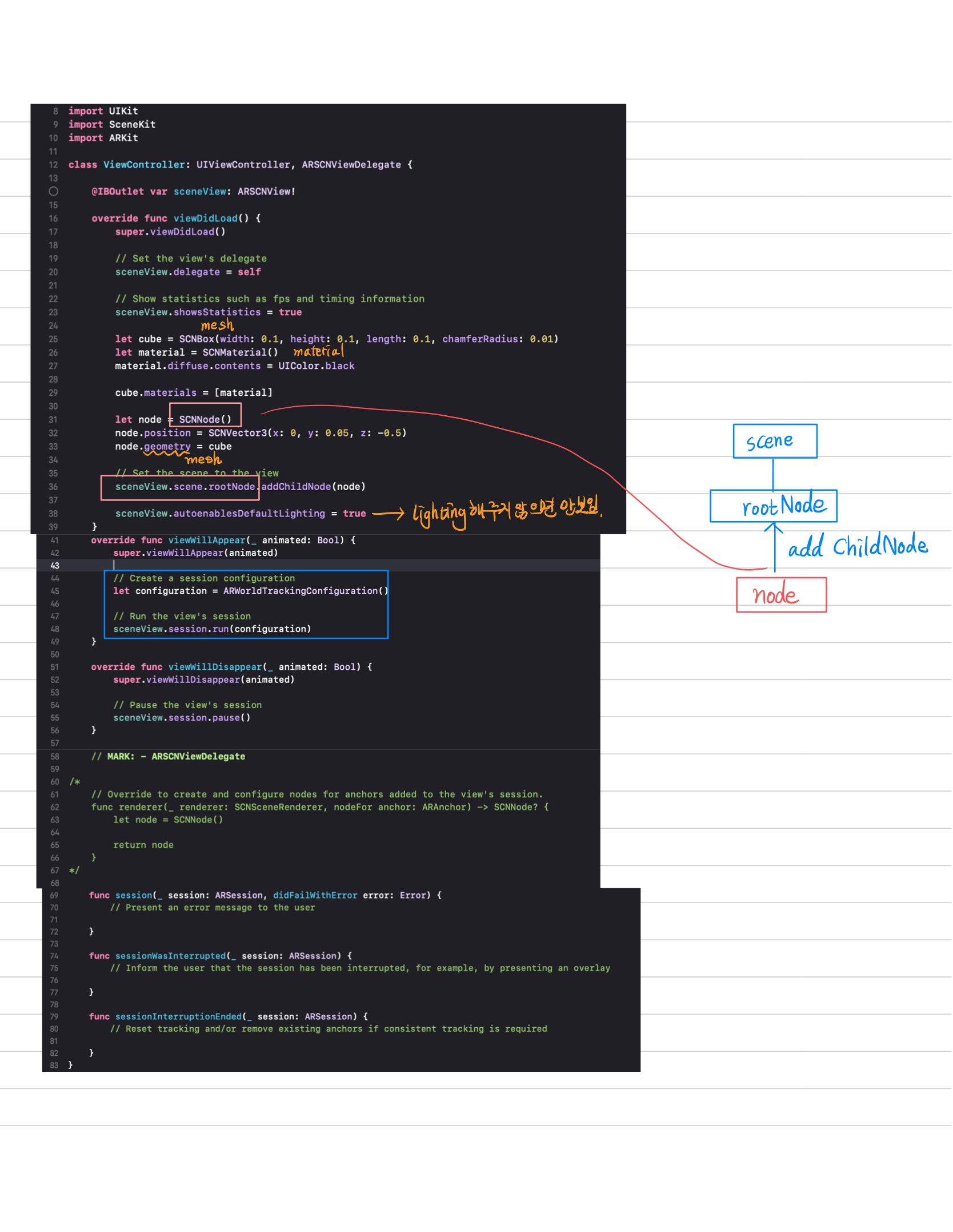 - SceneKit: material을 씌운 node를 scene.rootnode에 child로 달아주기!