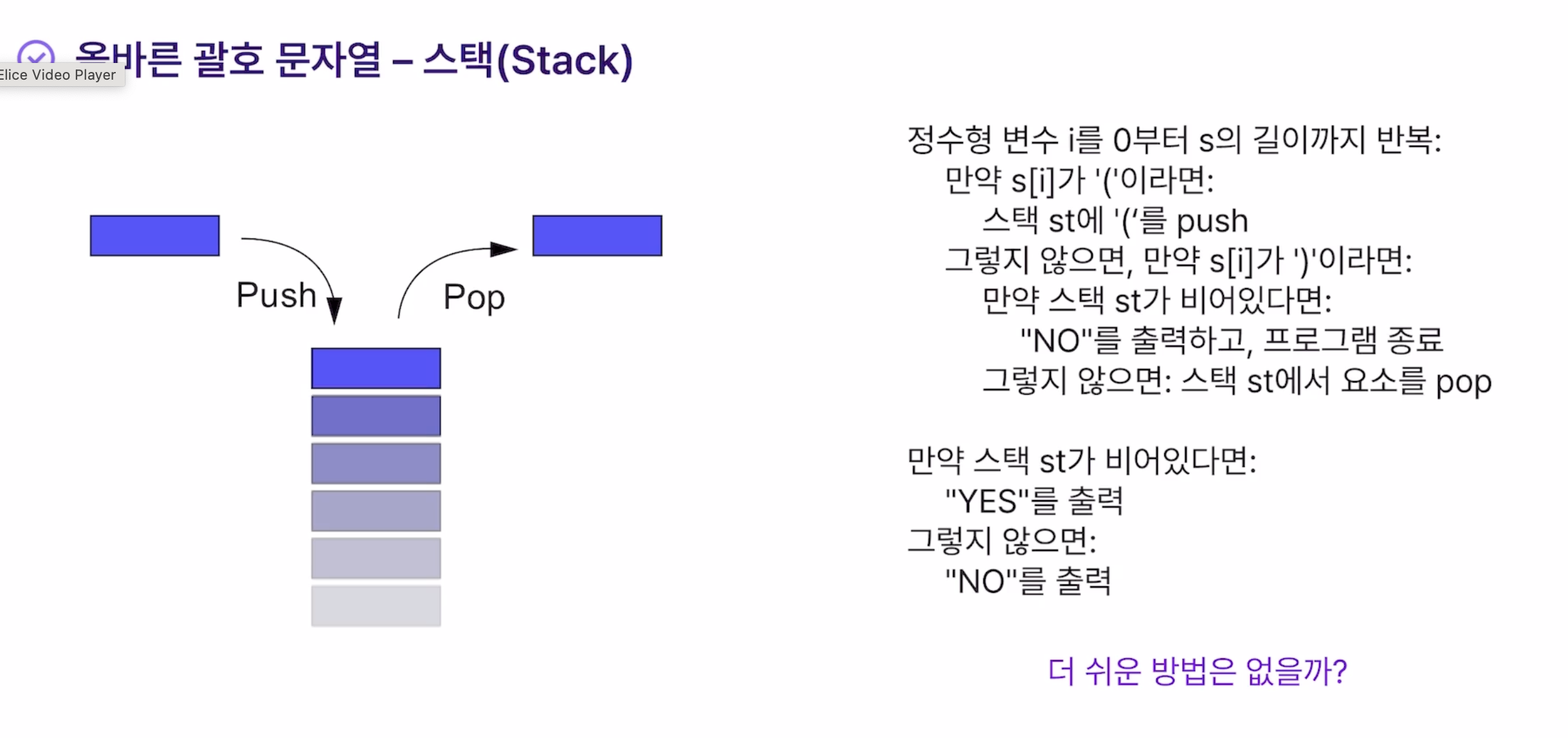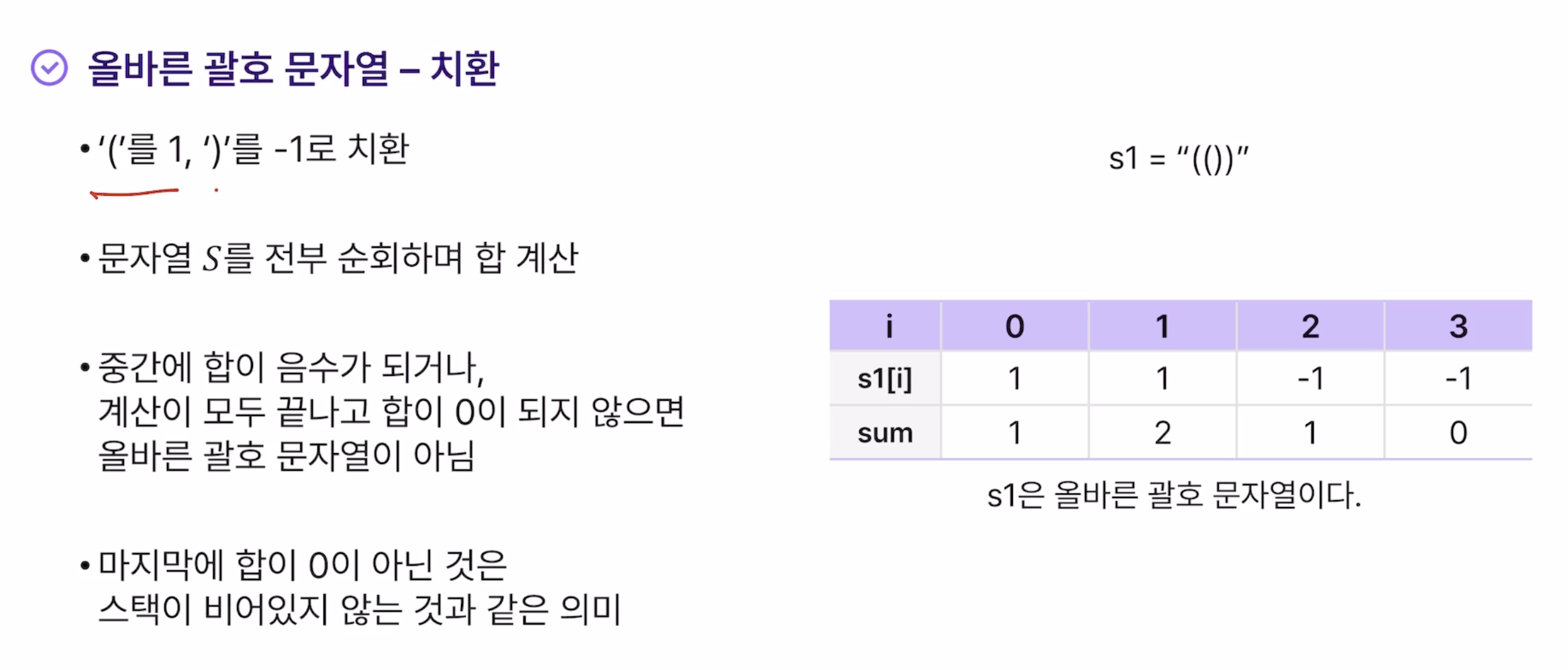 - 모든 문자열을 순회한 뒤, 스택이 비어있으면 올바른 괄호 문자열이고 비어있지 않으면 올바르지 않은 괄호 문자열임
