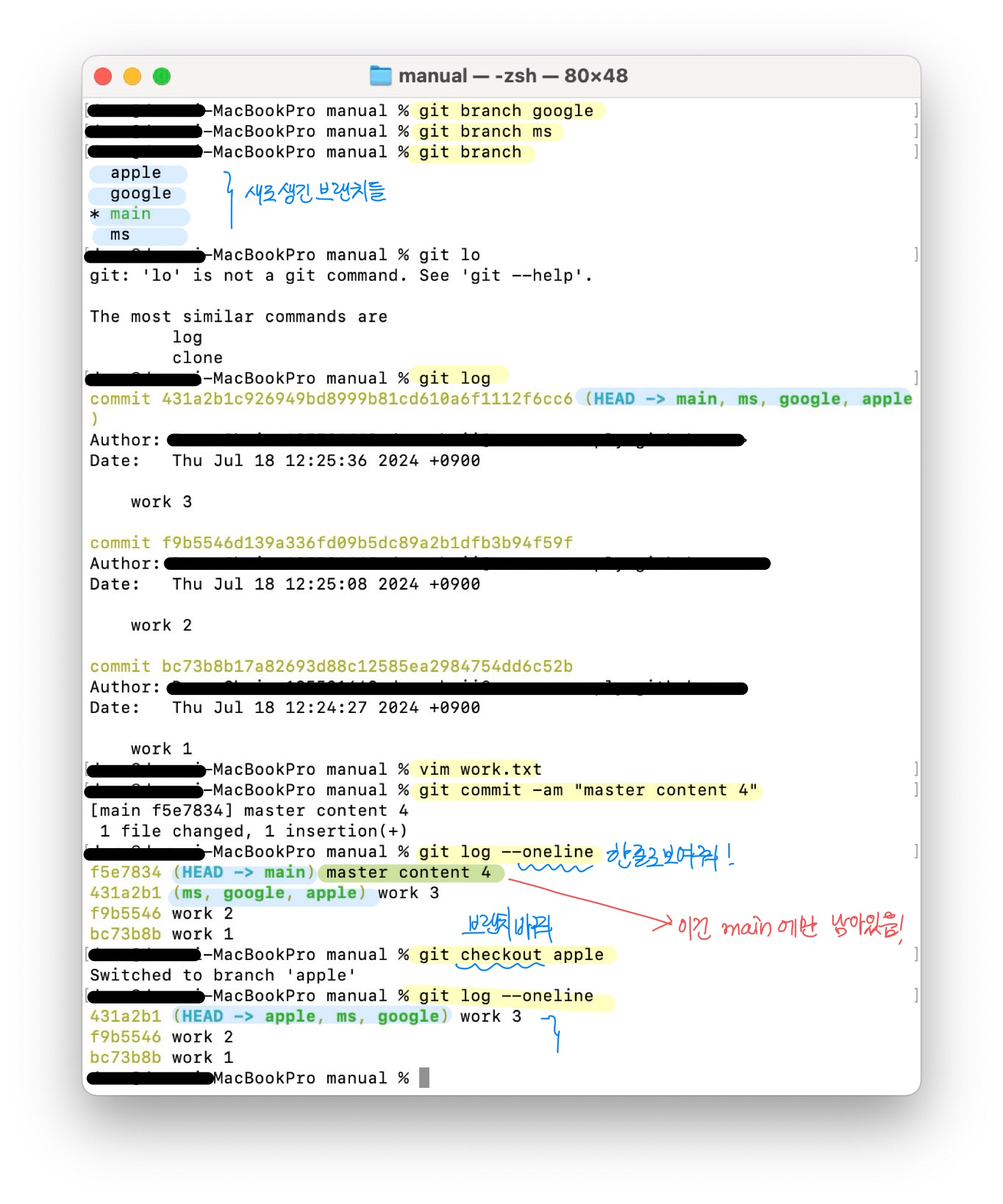 git log apple..main : apple에는 없고 main에만 있는 커밋