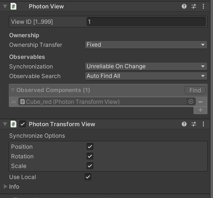 동기화되어야 하는 GameObject에 아래 두 스크립트를 컴포넌트로 달아주어야 한다.