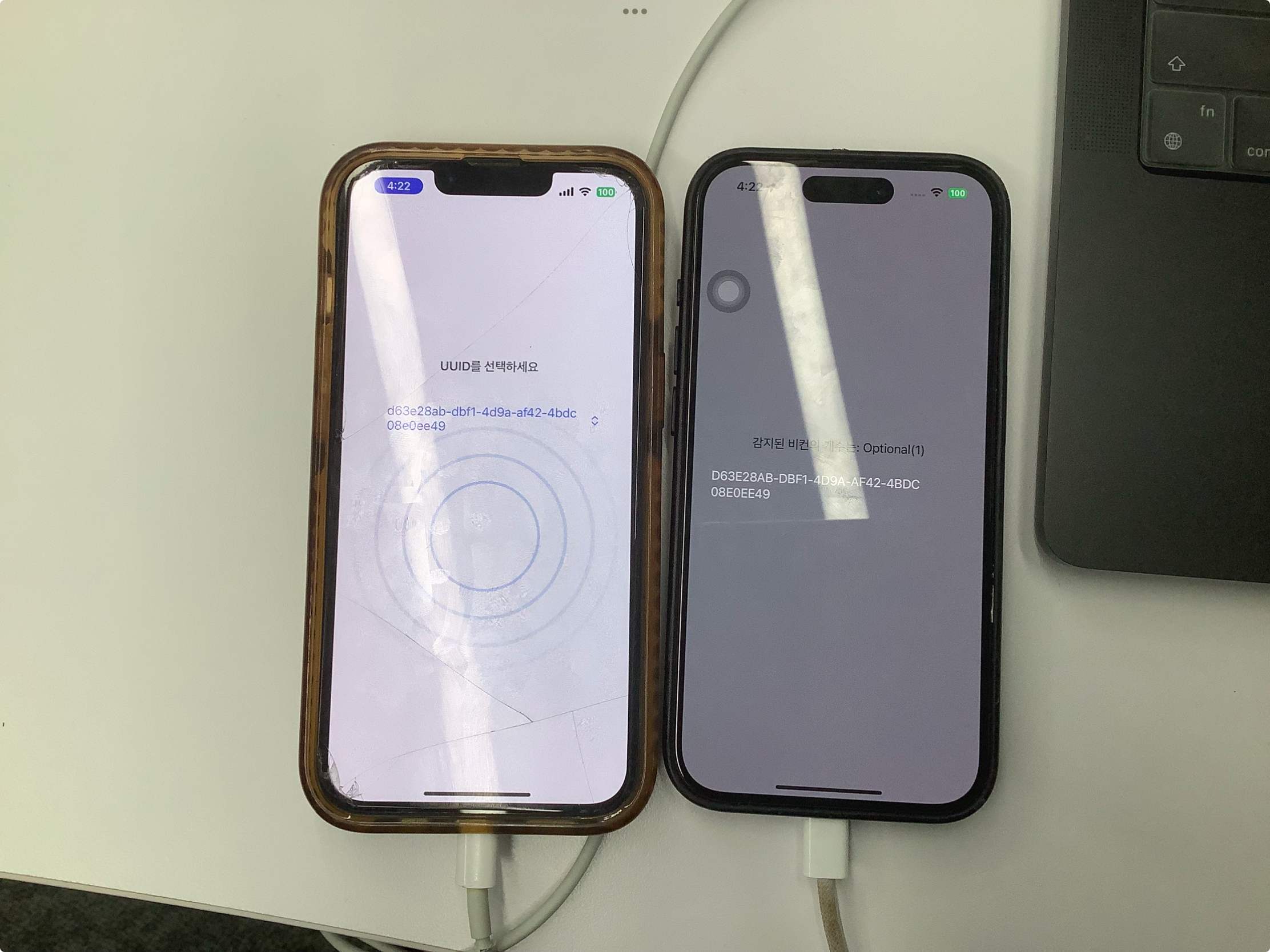 비콘의 UUID로 장소 바꿔가며 정지한 장소에서 해당 정보가 다르게 뜨는지 확인할 수 있다!